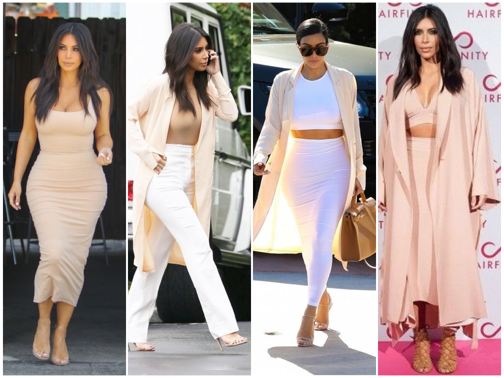 Ao analisar o estilo da Kim apercebi-me que raramente varia. Os looks dela têm uma paleta de cores bastante restrita - nude, branco, preto, militar, bordeaux, cinza e pouco mais. É adepta dos conjuntos monocromáticos, modelos colantes e saias ou vestidos midi sempre justos.