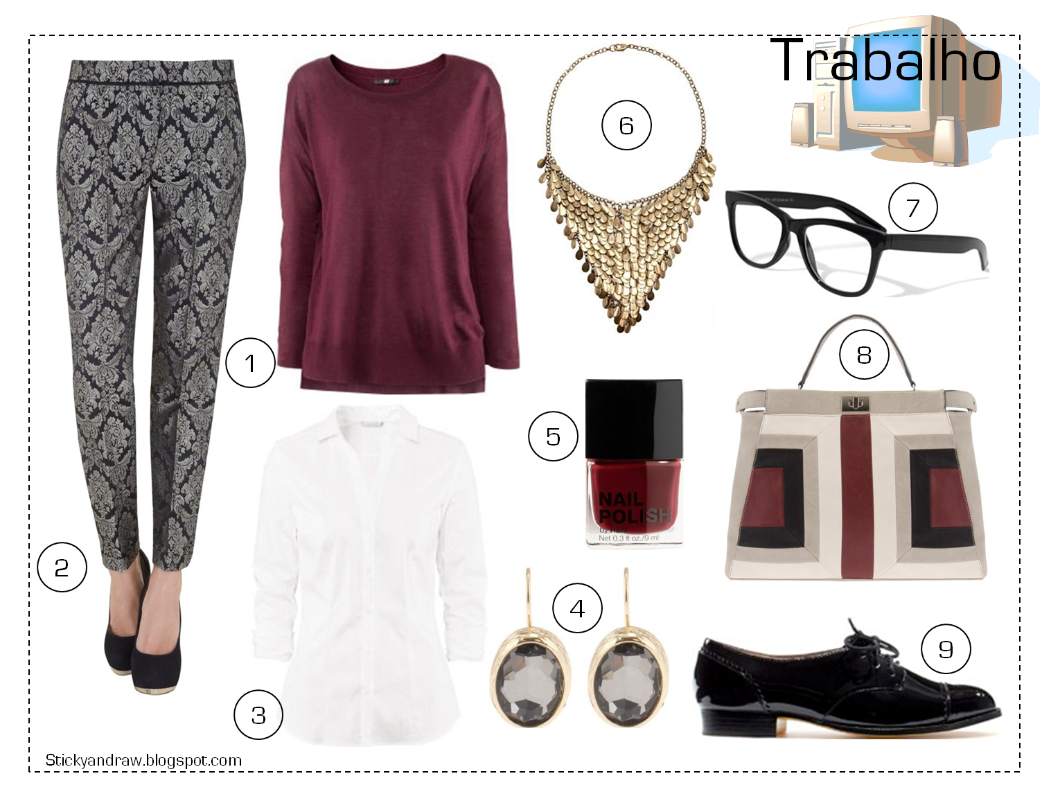 1. Camisola H&M 19.95€; 2. Calças Blanco, 32.99€; 3. Blusa H&M, 14.95€; 4. Brincos Parfois, 6.99€; 5. Verniz H&M, 3.95€; 6. Colar Bershka, 15.99€; 7. Óculos Zara, 12.95€; 8. Mala Parfois 33.99€; 9. Oxford Shoes Zara, 35.95€.