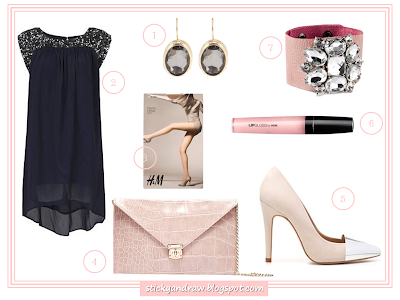 1. Brincos Parfois, 6.99€; 2. Vestido Mango, 39.99€; 3. Collants H&M, 4.95€; 4. Clutch Blanco, 15.99€; 5. Sapatos Zara, 45.95€; 6. Lip Gloss H&M, 3.95€; 7. Pulseira H&M, 9.99€.