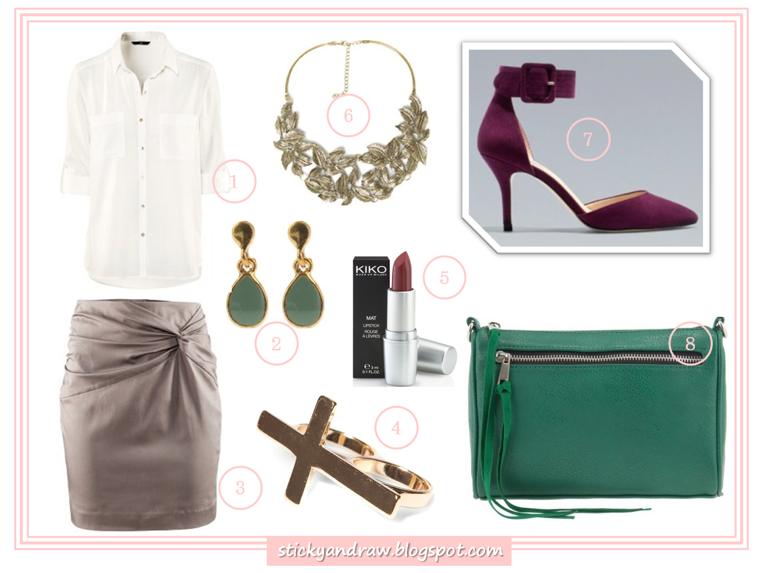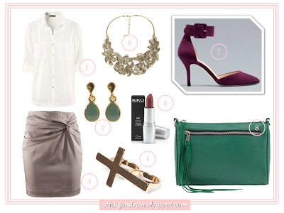 1. Blusa H&M, 19.99€; 2. Brincos Parfois, 5.99€; 3. Saia H&M, 24.95€; 4. Anel Pull and Bear, 4.99€; 5. Batom Kiko Cosmetics, 3.00€; 6. Colar Zara, 15.95€; 7. Sapatos Zara, 29.95€; Clutch Parfois, 16.99€.