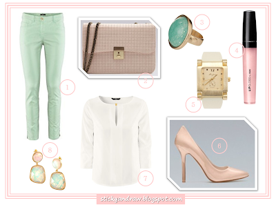 1. Calças H&M, 29.95€; 2. Mala Bershka, 19.99€; 3. Anel Primark, 3.00€; 4. Lip Gloss H&M, 3.95€; 5. Relógio Parfois, 22.99€; 6. Sapatos Zara, 19.95€; 7. Blusa H&M, 19.95€; 8. Brincos H&M, 4.95€.