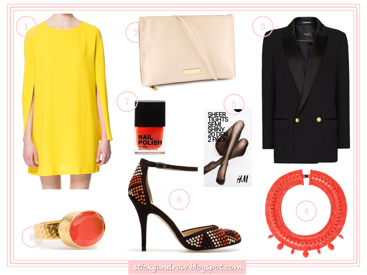 Claro que depois de tudo isto, é óbvio que um blazer pode ir a um casamento. E verdade seja dita, é bem melhor do que aqueles mini-casacos-só-com-as-mangas que eu chamava "manguitos" quando tinha uns 8 no armário, no alto dos meus 13 anos. Ganhei-lhes comichão desde então. Anyway, o blazer vai muito bem com vestido de cerimónia, sim. Mas não todos, não em todas as situações, não em todos os modelos. Neste caso, e na minha modesta opinião, acho que vai muito bem. Escolhi mais uma vez o amarelo - cor que eu gosto bastante -, um colar bem vistoso e única bijuteria no conjunto, uma vez que a clutch desempenha quase a função dela. Umas sandálias muito simples, elegantes e clássicas. Não é assim tão difícil, pois não?