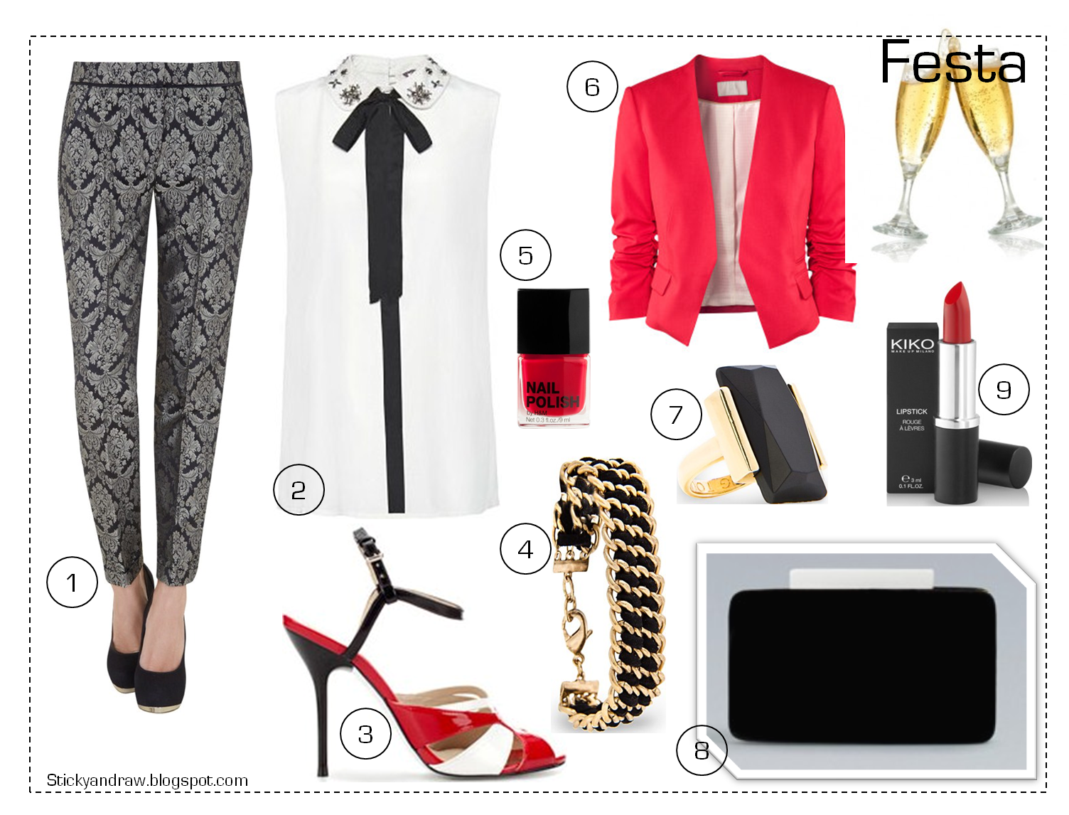 1. Blazer H&M, 29.95€; 2. Calças Mango, 29.99€; 3. Verniz H&M, 3.95€; 4. Sandálias Primark, 15€; 5. Lip gloss H&M, 2.95€; 6. Pulseira Parfois, 12.99€; 7. Camisa Blanco, 22.99€; 8. Colar Blanco, 16.99€; 9. Clutch Primark, 7€.