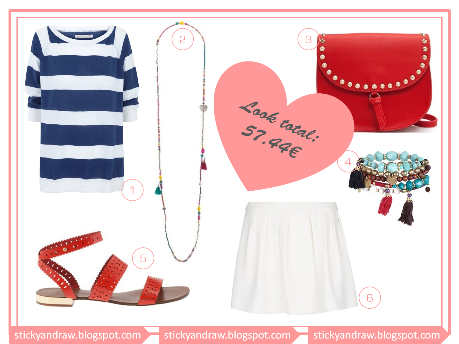 1. Jumper Blanco, 13.99€; 2. Colar Parfois, 4.99€; 3. Mala Mango, 8.99€; 4. Pulseira Blanco, 3.49€; 5. Sandálias Parfois, 12.99€; 6. Saia-calção Mango, 12.99€.