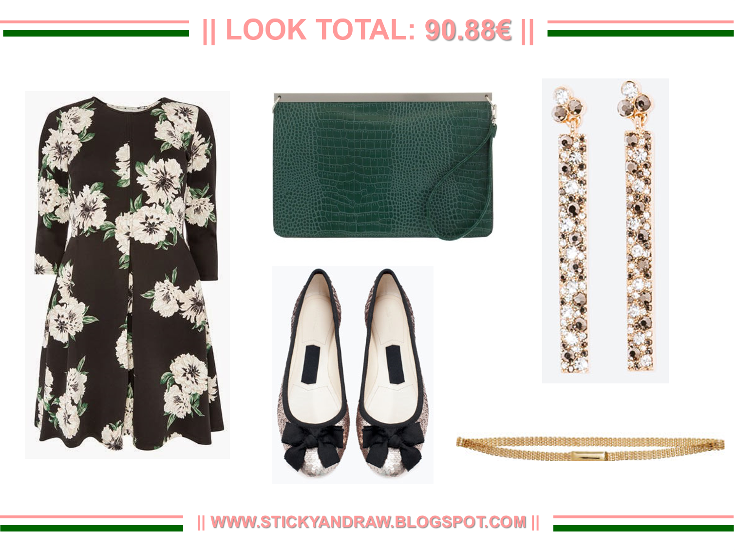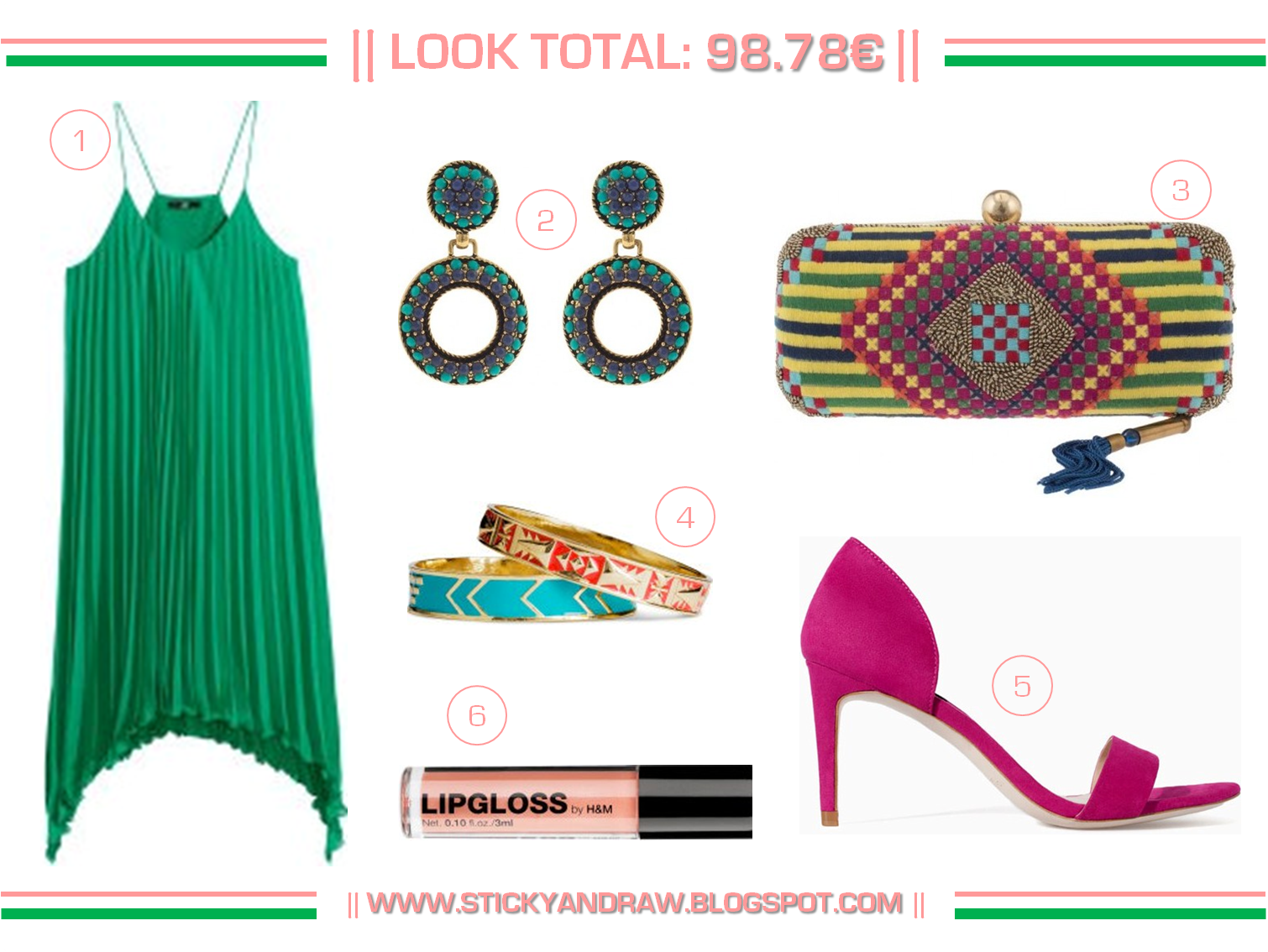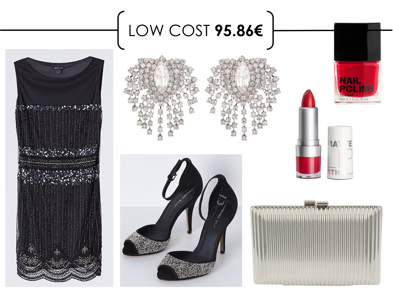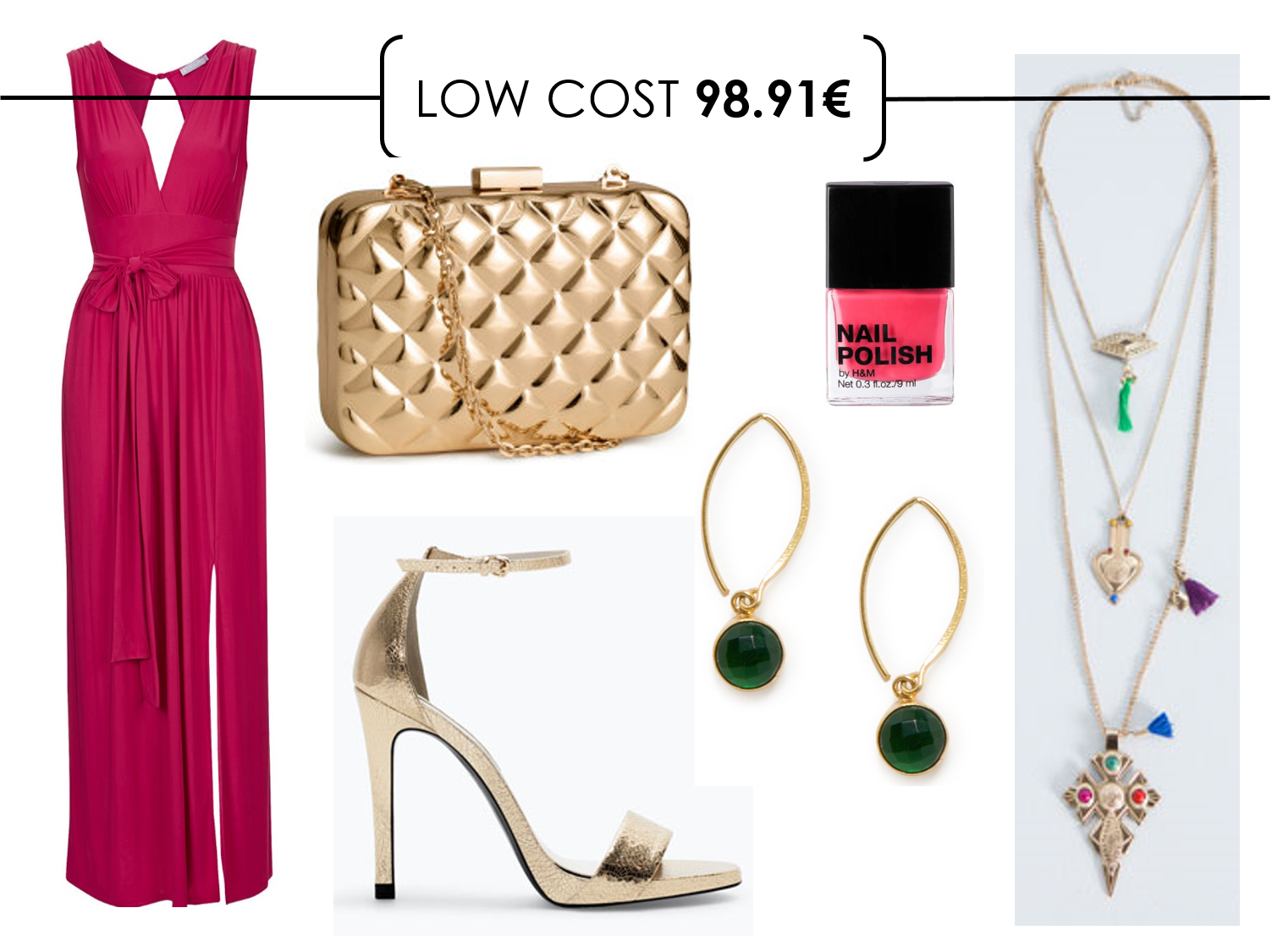 Vestido Topshop 20€ | Clutch H&M 19.99€ | Sandálias Zara 39.99€ | Verniz H&M 3.95€ | Brincos Mango 9.99€ | Fios Bershka 4.99€