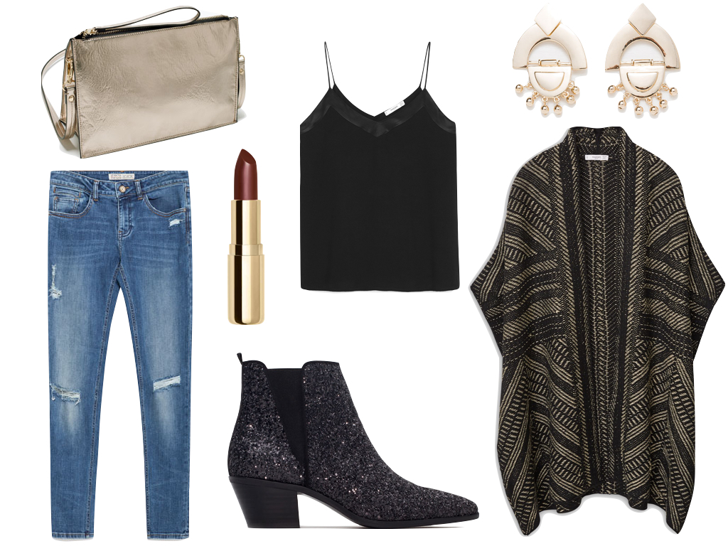 Se preferirem um meio termo, o de ir jantar fora mas num sítio tranquilo, bonito e agradável mas sem grandes chiquesas, então reparem bem neste conjunto. Tem tanto de casual como de festivo. O top é elegante mas versátil (todas deveriam de ter um top deste género no roupeiro), as calças de ganga são as do dia a dia, o cardigan tem uns fios dourados mas é perfeito para usar durante a semana também. Os complementos dão um toque de Natal, como a clutch dourada e os botins com purpurinas - que não chamam assim tanto a atenção quanto isso. É o meio termo entre os dois looks de cima. Nem demasiado festivo nem demasiado casual.
