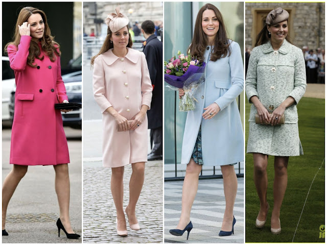 Outra grande predominância nas escolhas de Kate - e de todas as senhoras que pertencem a famílias reais - são os casacos-vestidos. Aqui quatro exemplos de modelos mais fluídos...