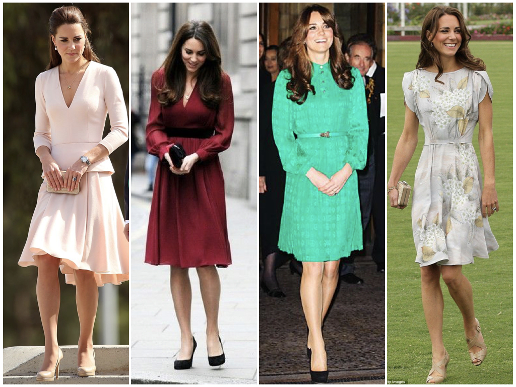 Entrando agora na secção dos vestidos de cerimónia, esta é a minha seleção favorita. Todos midi, todos perfeitos. Acho que o primeiro é altamente improvável para a duquesa mas funciona na perfeição. Sou apaixonada por todos eles, sem exceção. E não consigo escolher o mais bonito. Reparem em alguns truques que a duquesa usa quando escolhe este comprimento de vestido traiçoeiro (principalmente para as baixinhas e não tão magrinhas como a Kate - eu, eu, eu!): sapatos nude, bicudos e de salto bem alto para dar continuidade à perna e parecer bem mais alta e corte muito cintado para dar estrutura (para perceber as curvas). Aposta ganha!
