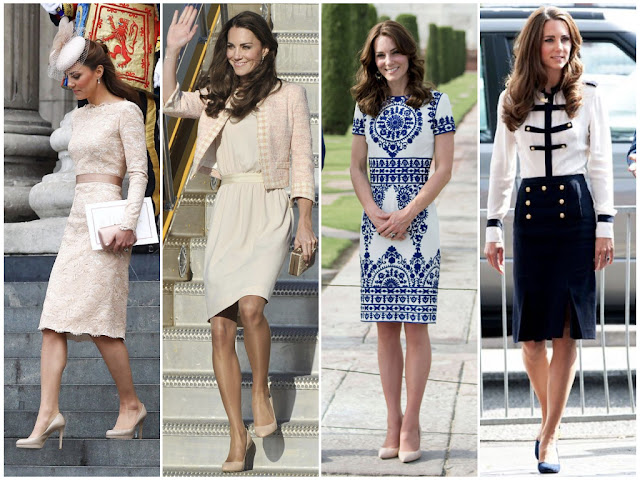 Por vezes vemos a duquesa em vestidos rendados. Quer sejam modelos de cerimónia, quer em looks mais casuais, Kate fica sempre deslumbrante. Reparem que utiliza sempre o mesmo tipo e cor de calçado quando usa vestidos.