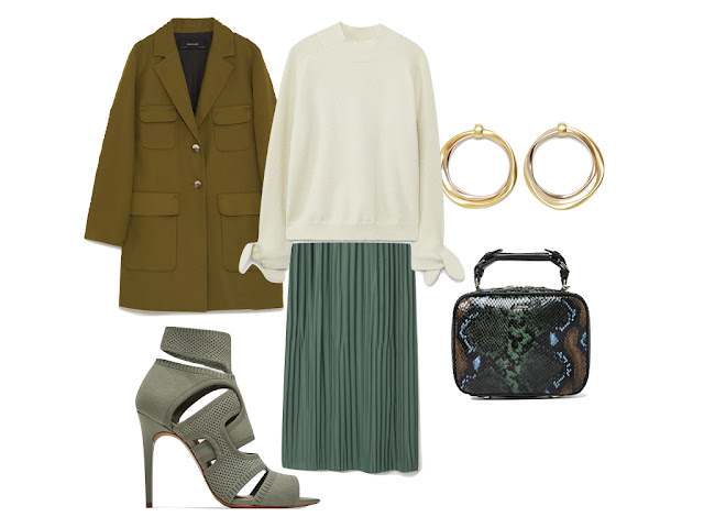 Brincos 9,99€ Mango | Argolas 35€ Bimba Y Lola | Óculos de Sol 15,95€ Zara | Sandálias Verdes 55,95€ Zara | Sapatilhas 39,99€ Mango | Carteira 99€ Uterque | Sapatos 39,95€ Zara | Cinto 5,99€ Pull & Bear | Saco 29,95€ Zara