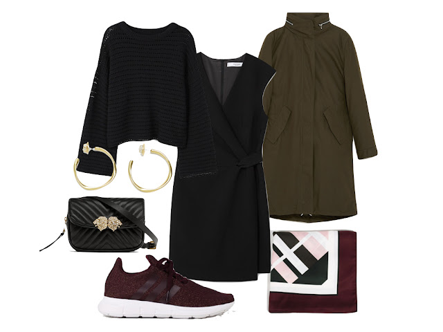 Impermeável 29,95€ Zara Join Life | Top preto 9,99€ H&M Consious Collection | Top estampado 12,99€ H&M Consious Collection | Leggins 19,99€ H&M Consious Collection |