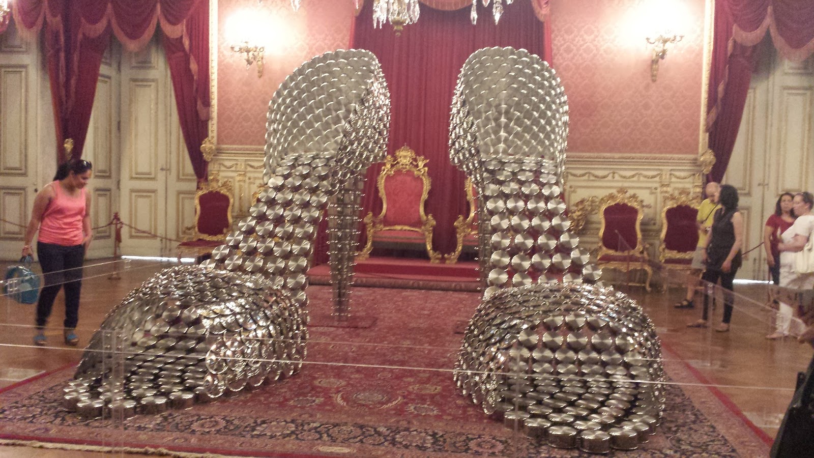 Quando soube que uma das minhas artistas portuguesas favoritas há pelo menos 5 anos (bem antes de ter tanto sucesso como agora) ia expor em Versailles fiquei histérica. Cheguei a partilhar convosco aqui o orgulho que tinha nela. Mas ao mesmo tempo sentia-me muito triste por não puder ir visitar a sua exposição. "Um dia hei-de ver a sua obra!" e esse dia chegou. No domingo, a caminho de casa, fizemos um desvio até Lisboa em direção ao Palácio Nacional da Ajuda propositadamente para ver as obras do nosso orgulho nacional. Os meus pais e o meu irmão não são muito apreciadores de arte (como quase a maioria das pessoas, infelizmente) no entanto, fui incutindo com o tempo os feitos desta artista e a genialidade das suas obras. Eles lá iam entusiasmados para verem os sapatos em panelas, o coração em talheres de plástico e o lustre em tampões... E eu para ver tudo!